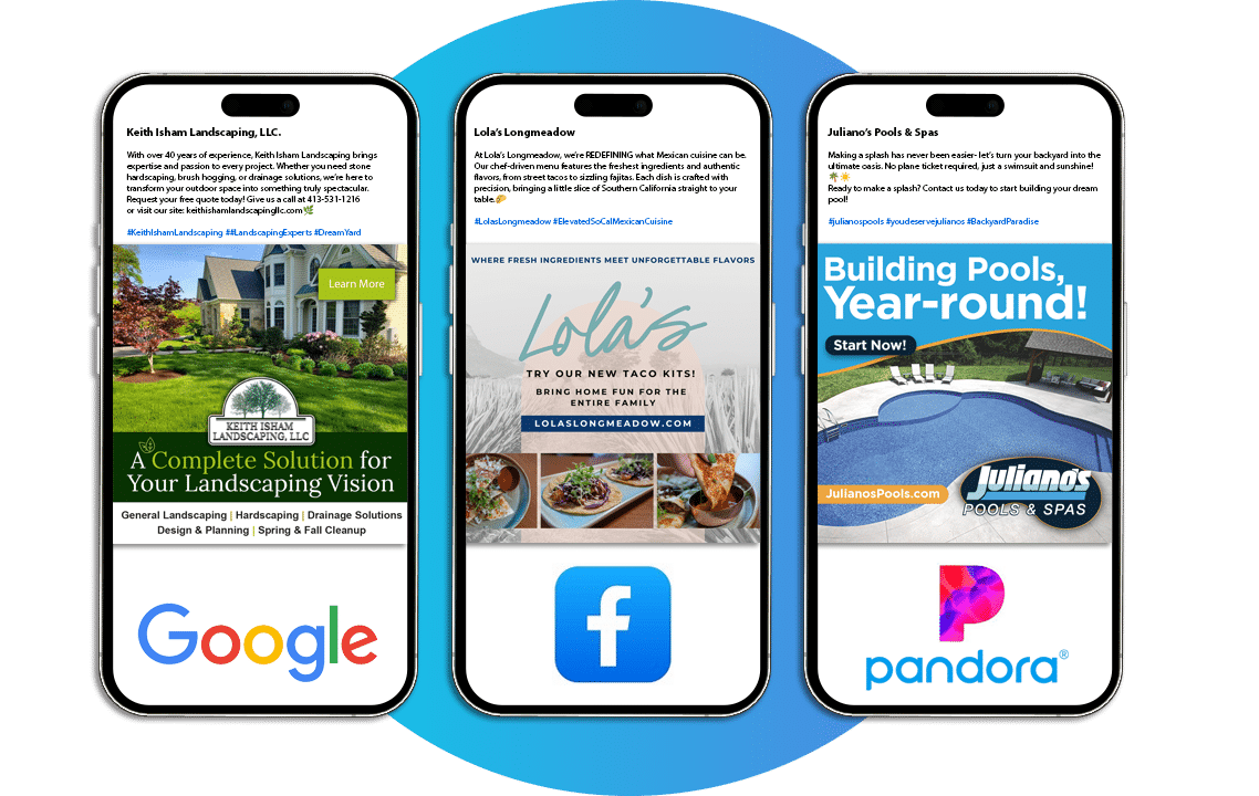 Programmatic display ads and Google Display Network ads target relevant businesses and consumers based on intent using keywords, demographics and geo-targeting, consumer browsing tendencies, competitor keywords, purchase behavior, recent searches, content consumption, and more. Your ads will appear on desktops & mobile devices as potential customers surf the web and use their devices.