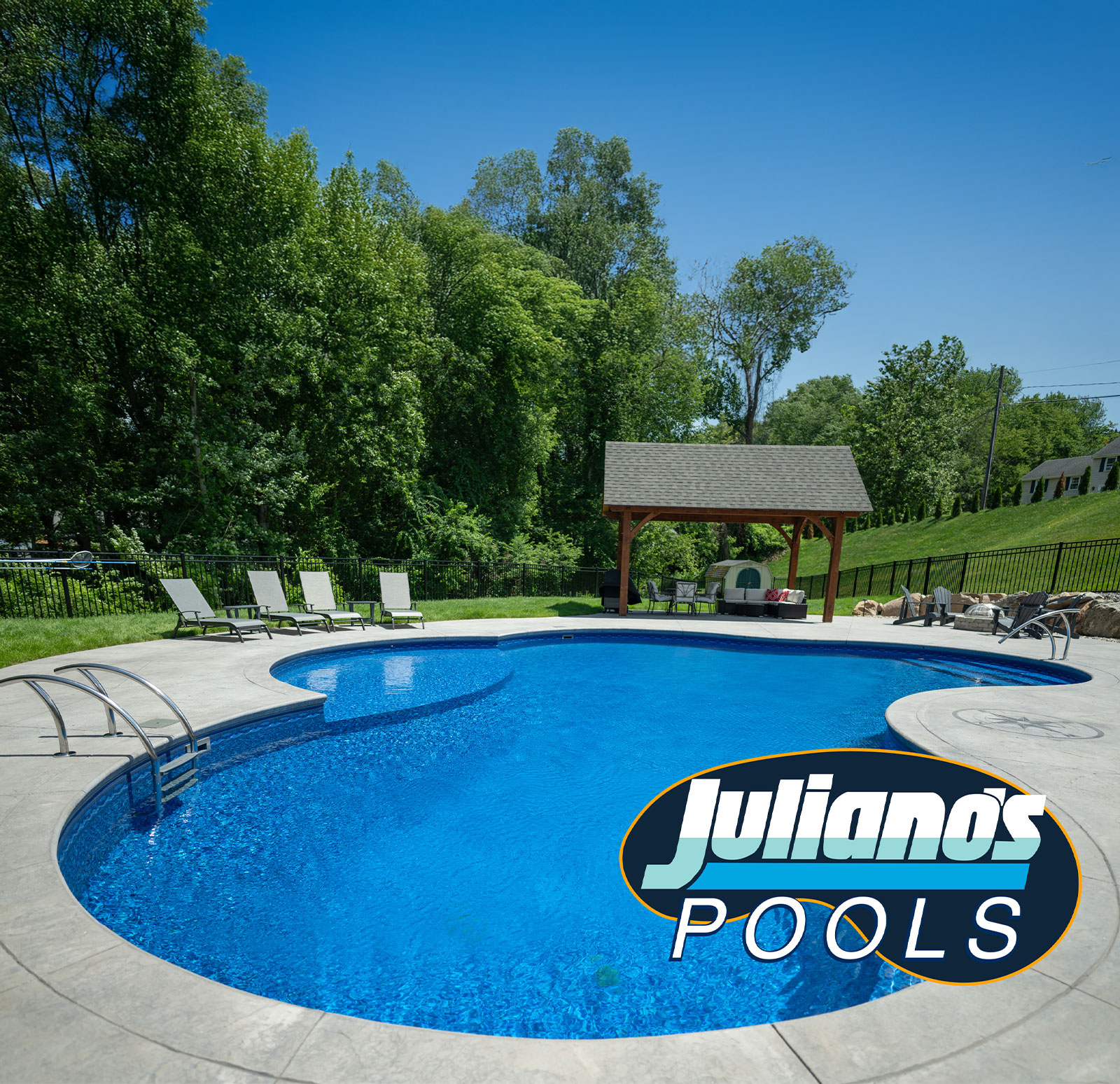 Banner ad for Juliano’s Pools & Spas shows a blue swimming pool with a stone waterfall, stone walls, and the text “BOOK NOW! SWIM ALL SEASON.” Website www.JulianosPools.com is displayed in an orange box.