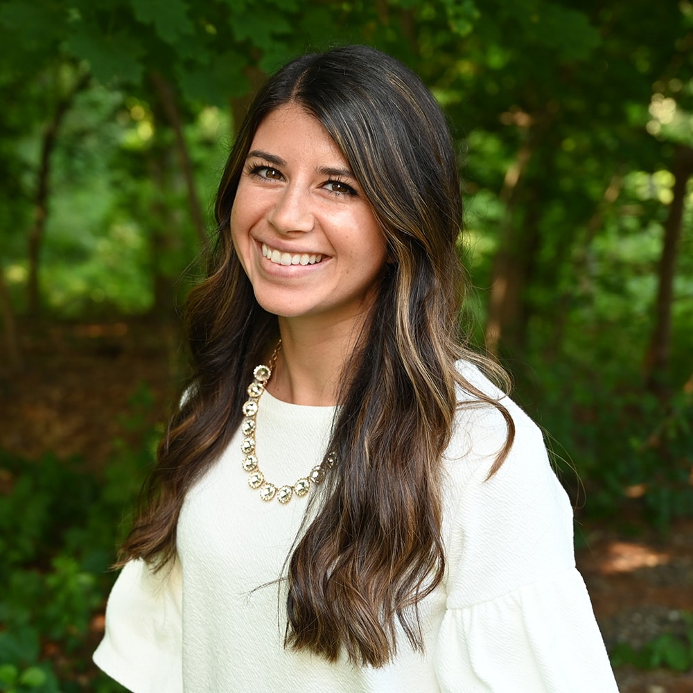 A young woman with long brown hair wearing an orange blouse stands smiling in front of a calm lake, with green trees and a grassy area visible in the background.