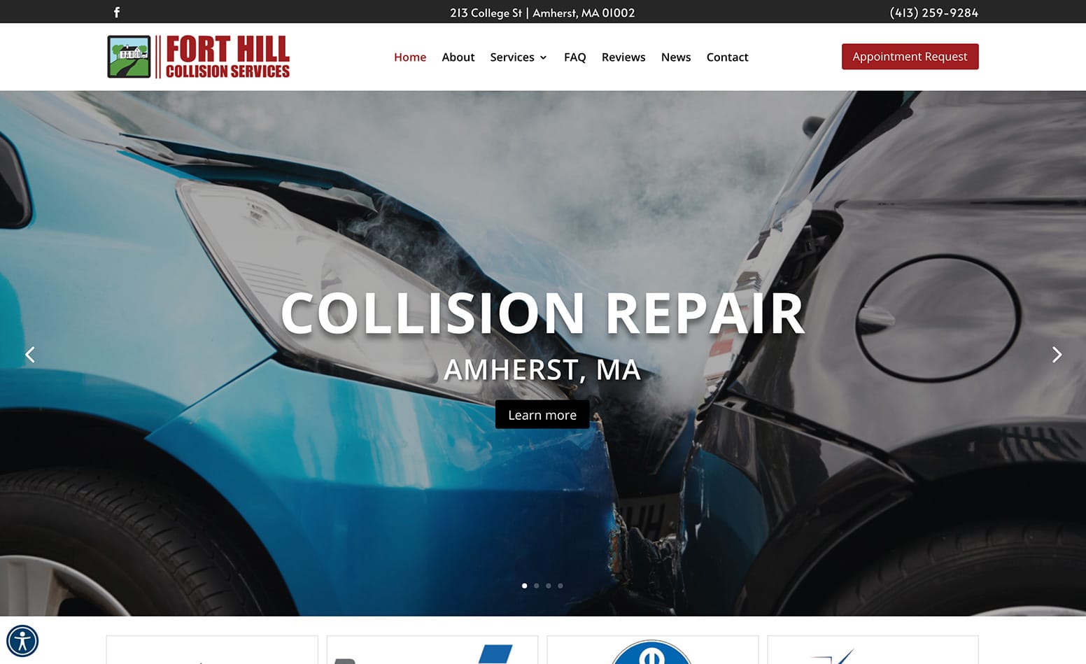 Check out our custom WordPress website design for Fort Hill Collision Services in Amherst, MA. Our website design team created a site that effectively represents their expertise in auto body repair and collision services. The design features a professional and clean layout that highlights their range of services, from dent repair to paint jobs, and shows their commitment to quality craftsmanship.