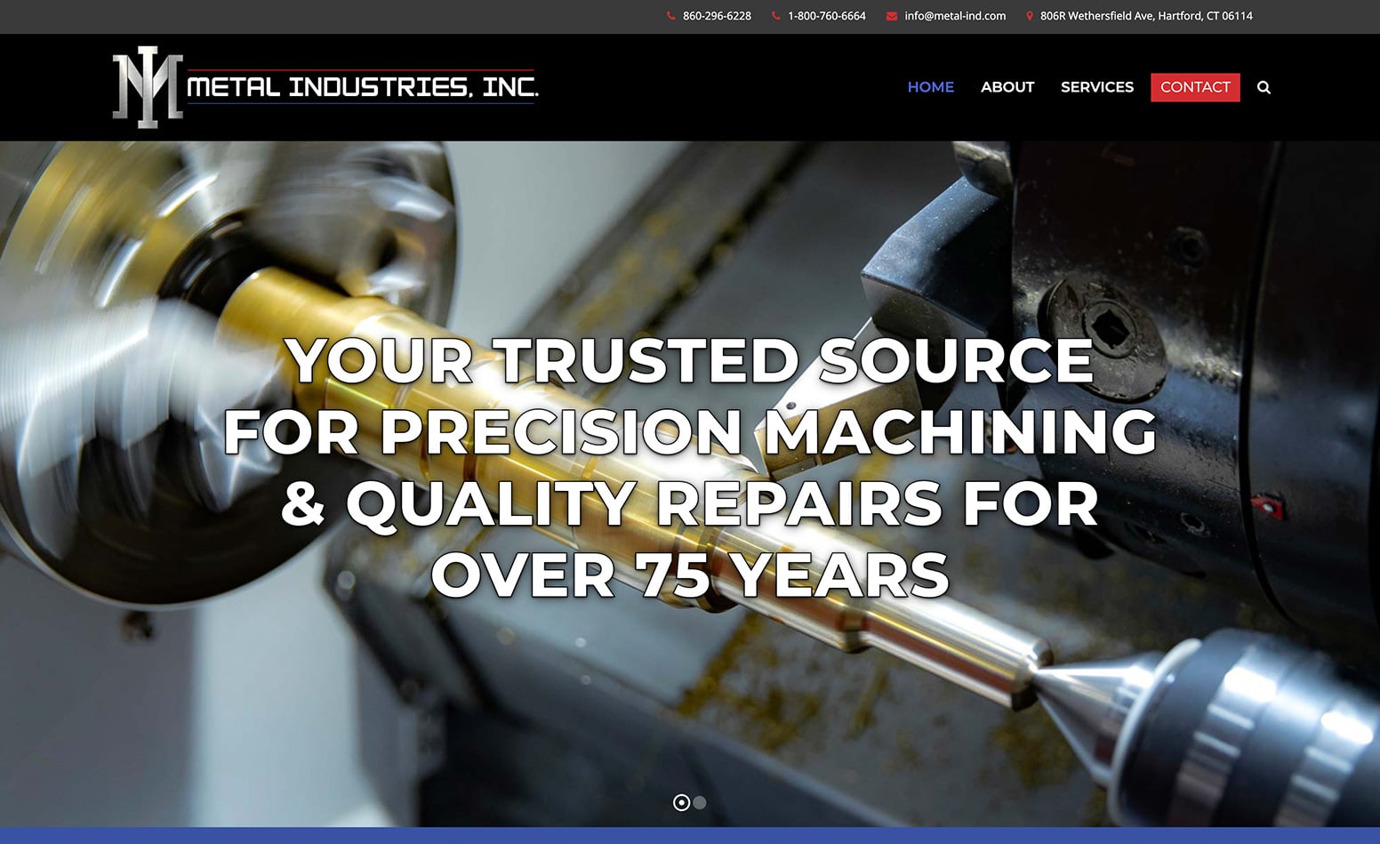 Take a look at our custom WordPress website design for Metal Industries, Inc. in Hartford, CT. Our web design team developed a website that effectively captures the essence of their expertise in metal fabrication and manufacturing. The design has a modern and professional layout tailored to highlight their extensive range of services, from custom metalwork to precision machining and large-scale industrial projects.